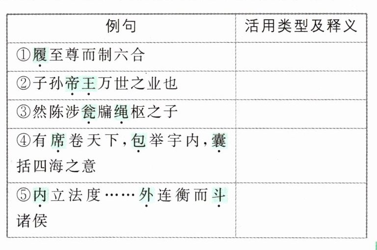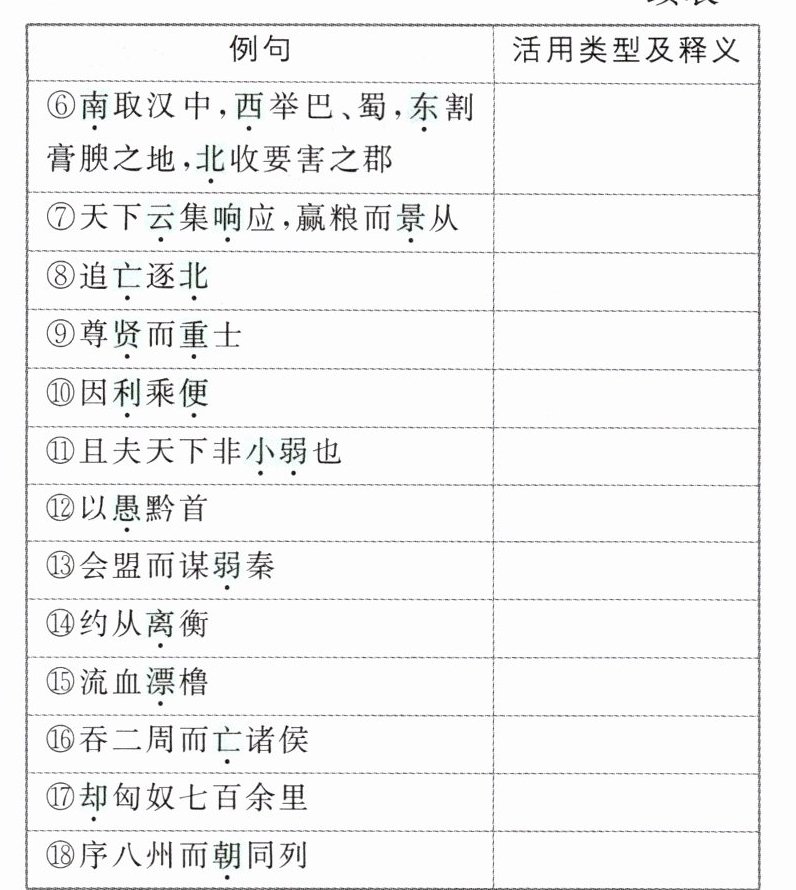 4答案①名词作动词,登上②名词作动词,称帝称王③名词作动词,用瓮做/用草绳系④名词作状语,像席子一样/像包裹一样/像口袋一样⑤名词作状语,对内/对外;使动用法,使……争斗⑥名词作状语,向南/向西/向东/向北⑦名词作状语,像云一样/像回声一样/像影子一样⑧动词作名词,逃跑的人/败逃的军队⑨形容词作名词,贤能的人;意动用法,以……为重⑩形容词作名词,“利”和“便”都指“便利的条件”⑪形容词作动词,变小/变弱⑫使动用法,使……变愚蠢⑬使动用法,使……变弱⑭使动用法,使……离散⑮使动用法,使……漂浮⑯使动用法,使……灭亡⑰使动用法,使……退却⑱使动用法,使……朝见