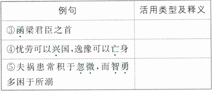 3答案①名词作状语,向东②名词作状语,在夜里③名词作动词,用匣子装④使动用法,使……兴盛/使……灭亡⑤形容词作名词,极小的事/聪明勇敢的人