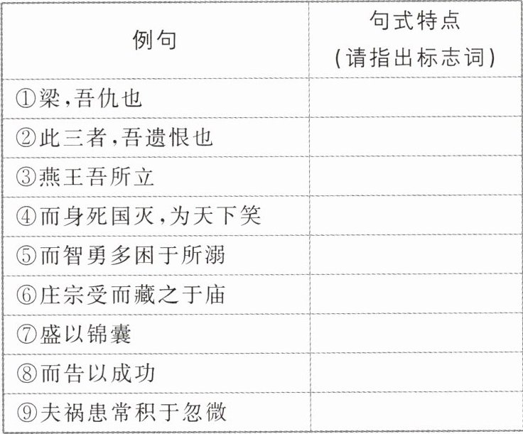 4答案①判断句标志词:也②判断句标志词:……者……也③判断句无标志词④被动句标志词:为⑤被动句标志词:于⑥状语后置句标志词:于⑦状语后置句标志词:以⑧状语后置句标志词:于