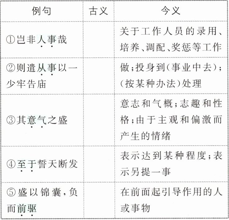 1答案①人的作为②官名,这里泛指一般属官③气势④表示不好的结果,相当于“以致”⑤在前奔驰