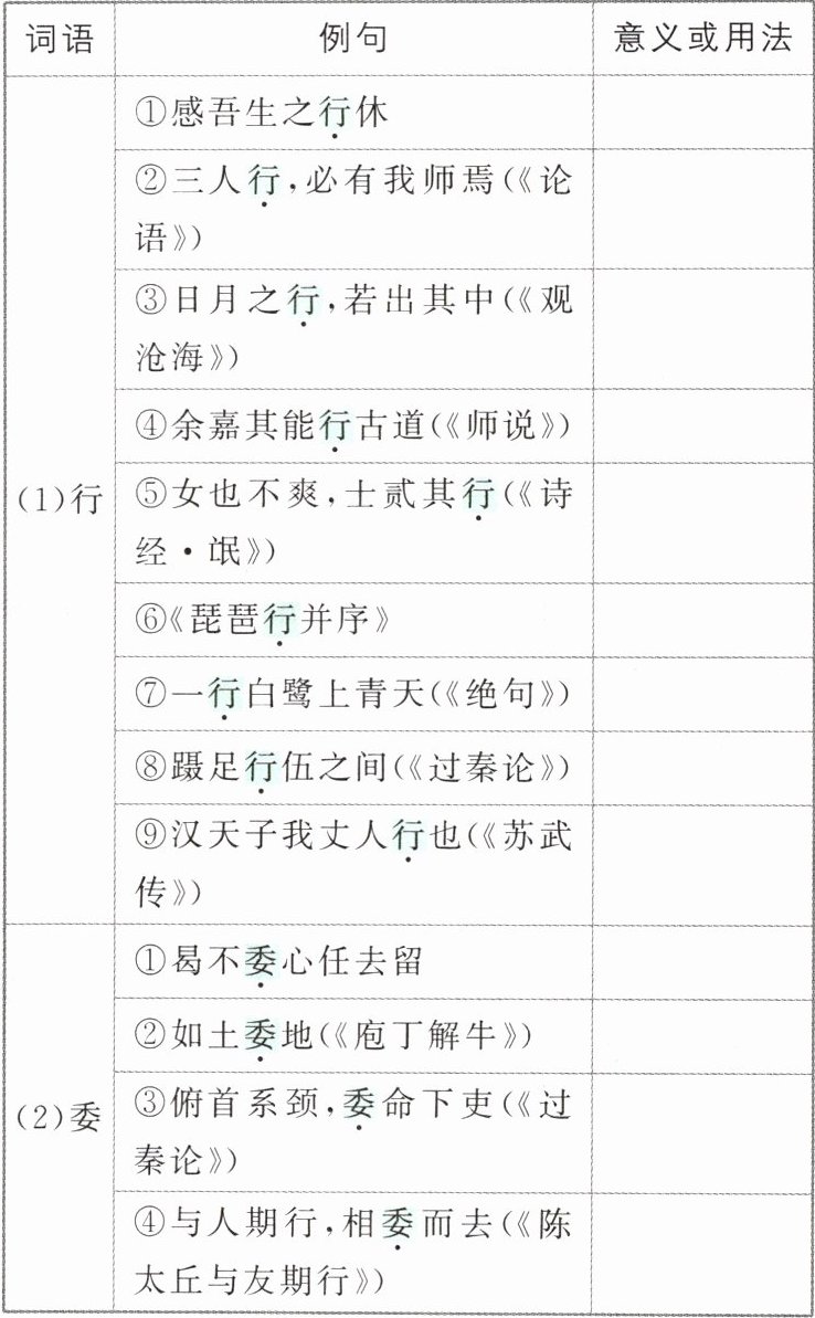 2.答案 (1)①副词,将要 ②动词,走路 ③动词,运行 ④动词,实行,执行 ⑤名词,行为 ⑥名词,古诗的一种体裁 ⑦量词,排 ⑧名词,泛指军队 ⑨名词,辈