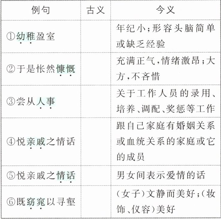 1.答案 ①小孩 ②感叹 ③做官 ④内外亲属,包括父系亲属和母系亲属 ⑤知心话 ⑥幽深的样子