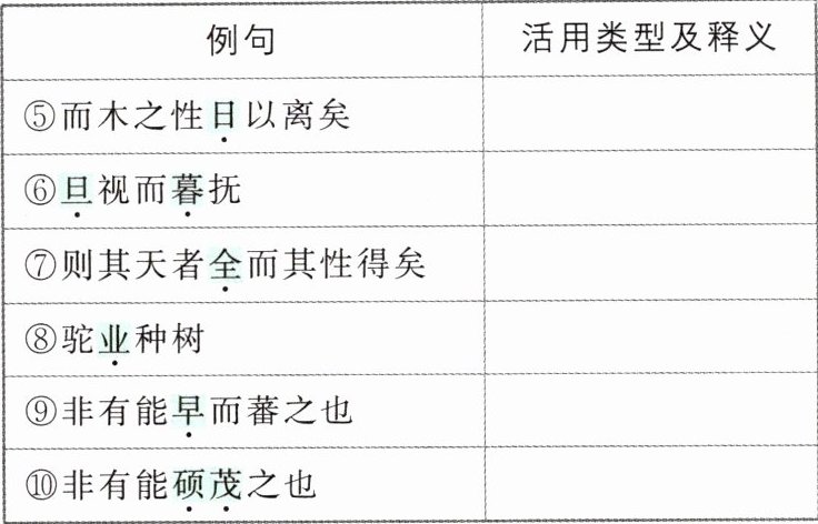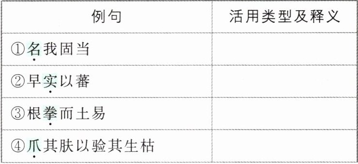 3答案 ①名词作动词,称呼 ②名词作动词,结果实 ③名词作动词,拳曲,伸展不开 ④指甲,用作动词,用指甲抠、掐 ⑤名词作状语,一天天地 ⑥名词作状语,在早上/在晚上 ⑦形容词作动词,保全 ⑧名词的意动用法,以……为业 ⑨形容词的使动用法,使……早 ⑩形容词的使动用法,使……高大茂盛
