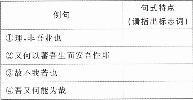 4答案 ①判断句 标志句:非、也 ②宾语前置句 标志词:何(宾语)、以(介词) ③宾语前置句 标志词:我、若 ④宾语前置句 标志词:何(宾语)、为(动词)