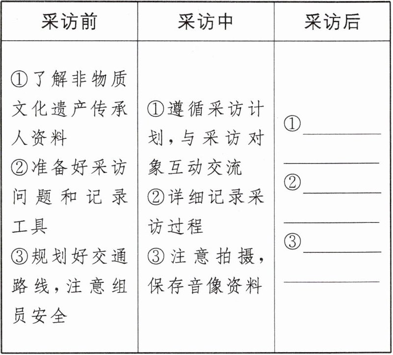 (1)班级决定采访家乡的非物质文化遗产传承人,请协助老师完善采访步骤。(3分)