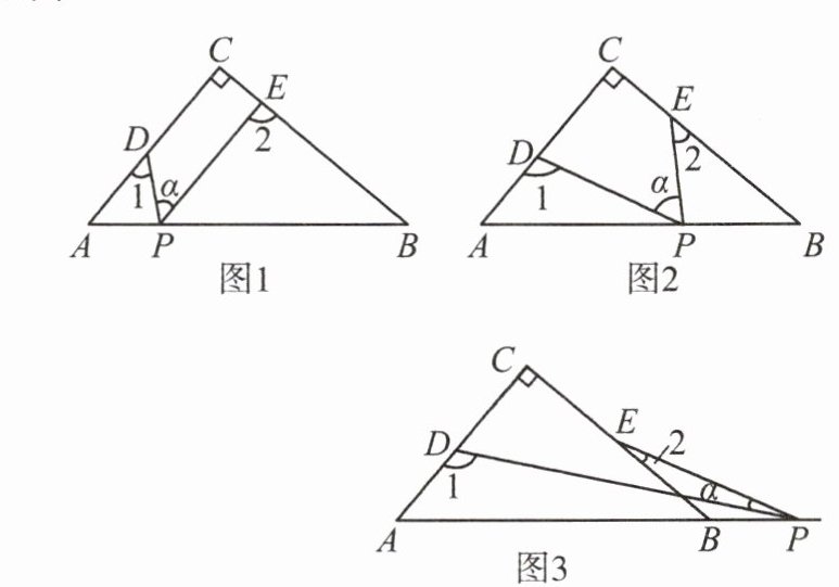 12.(2025·巴南区月考)在$Rt△ABC$中,$∠C=90^{\circ },$D,E 分别是$△ABC$的边 AC 和 BC 上的点,P 是直线 AB 上的一个动点.记$∠PDA=∠1,∠PEB=∠2,∠DPE=∠α$.
