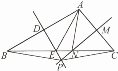 9.如图,在$\triangle ABC$中,$BC=12$,$\angle BAC=100^{\circ}$,$AB$的垂直平分线交$BC$于点$E$,交$AB$于点$D$,$AC$的垂直平分线交$BC$于点$N$,交$AC$于点$M$,连接$AE$,$AN$.