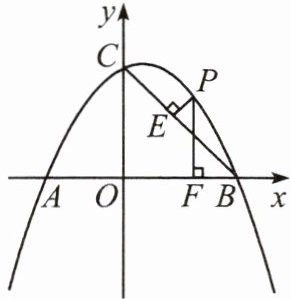 (2)如图,点$P$在线段$BC$上方的抛物线上运动,过点$P$作$PE⊥BC$于点$E,PF⊥x$轴于点$F$,求$\frac {\sqrt {2}}{2}PE+\frac {1}{2}AF$的最大值,以及此时点$P$的坐标.