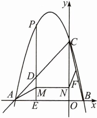 (2)$P$是射线$CA$上方抛物线上的一个动点,过点$P$作$PE⊥x$轴,垂足为$E$,交$AC$于点$D$,$M$是线段$DE$上的一个动点,$MN⊥y$轴,垂足为$N$,$F$为线段$BC$的中点,连接$AM,NF$.当线段$PD$长度取得最大值时,求$AM+MN+NF$的最小值.