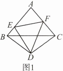 8. 如图 1,$ \triangle ABC $ 和 $ \triangle BDC $ 是等腰三角形,且 $ AB = AC $,$ BD = CD $,$ \angle BAC = 80^\circ $,$ \angle BDC = 100^\circ $,以 $ D $ 为顶点作一个 $ 50^\circ $ 角,角的两边分别交边 $ AB $,$ AC $ 于点 $ E $,$ F $,连接 $ EF $。