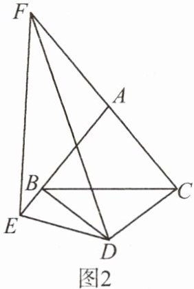 (2) 如图 2,若点 $ E $,$ F $ 分别在 $ AB $,$ CA $ 的延长线上,其他条件不变,则 $ BE $,$ EF $,$ FC $ 之间存在什么样的数量关系?请说明理由。