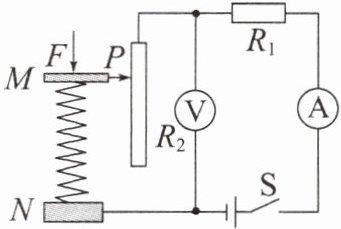 2. (2025·南开中学月考)测量压力大小的压力传感器可以由一只电压表改装而成,工作原理如图所示。其中M、N均为绝缘材料,M、N之间有可收缩的导线(电阻大小不计),导线上端和滑动变阻器$R_{2}$的滑片P固定在一起,电源电压恒为9V,已知压力F的大小与$R_{2}$的阻值大小成正比例关系。闭合开关S,压力$F_{0}=0N$时,滑片P在最上端;压力$F_{1}=1N$时,电流表的示数为0.5A,电压表的示数为1V;当滑片P滑至最下端时,$F_{2}=16N$。求: