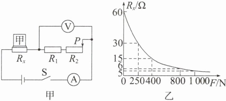 3. (2025·江北区期中)物理学习小组利用压敏电阻,发明了一种称重装置,其电路图如图甲所示,压敏电阻$R_{x}$与所受压力F的关系如图乙所示。将重物放在托盘上,托盘与压敏电阻$R_{x}$的接触面积S为$8×10^{-2}m^{2}$,托盘重力忽略不计。$R_{2}$在测量中起到微调作用,电流表的测量范围为0~0.6A,电压表的测量范围为0~15V。在某次测量时,先将$R_{2}$调至最右端,再把物体甲放到托盘上时,托盘对压敏电阻的压强为5000Pa,电压表示数先后变化了6V,电流表示数变化了0.2A。