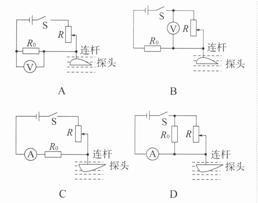 4. (学科内综合)(2023·四川广安中考)某科技兴趣小组为检测水流速度变化的情况,设计了检测水流速度变化的模拟电路。已知电源电压保持不变,$R_0$是定值电阻,机翼状的探头始终浸没在水中,通过连杆带动滑动变阻器R的滑片上下移动(注:水流速度越大,探头上、下表面的压力差越大)。下列能实现水流速度越大,电表示数越大的电路图是(