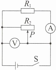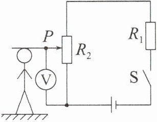 5. 初三实验小组的同学决定设计一个如图所示的简易身高测量仪,他们的设想是用滑片P在绷直的电阻丝$R_2$上移动代替滑动变阻器,将电压表改装成身高显示仪,且测量仪测量身高的范围能达到最大,测量精确度最高。已知电源电压(恒为12V)、电压表(测量范围0~3V)、长80cm的均匀电阻丝$R_2$(0.5Ω/cm)。下列说法正确的是(