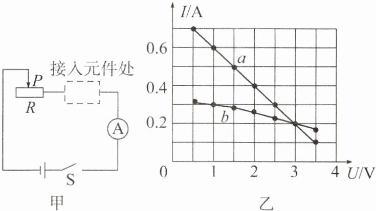7. (2023·重庆中考A卷)将一个定值电阻接入图甲所示电路的虚线框处,并将一个电压表(图中未画出)并联在某段电路的两端,闭合开关S,移动滑片P,多次记录两电表的示数;断开开关S,只将定值电阻更换为灯泡,再次获取数据并记录;将记录的数据绘制成如图乙所示的I-U图像。下列分析正确的是(