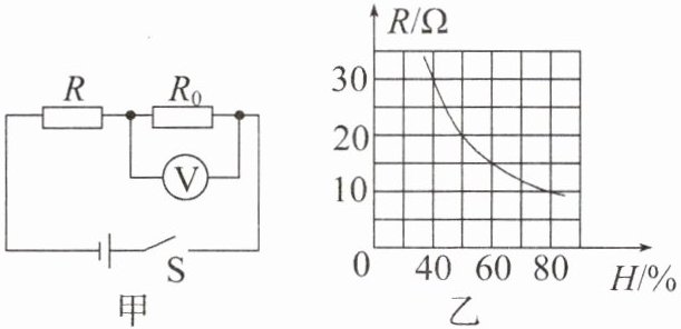 5. (2023·山西中考)小伟给学校劳动实践基地的蔬菜大棚设计了一个测量空气湿度的电路图,如图甲所示。电源电压恒为6V,定值电阻$R_0$的阻值为20Ω,湿敏电阻R的阻值随空气湿度H的变化关系如图乙所示。下列分析正确的是(