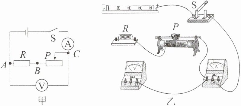 (2)断开开关,将电压表的测量范围改为0~3V,并联接在图甲中的A、B两点,检查电路无误后,闭合开关,向左移动滑片P,当电流表的示数为0.24A时,记下电压表的示数,设此时滑动变阻器连入电路的阻值为$R_{P1}$,接着将10Ω的定值电阻更换为15Ω的定值电阻,重做实验,当观察到电压表的示数为____V时,记下电流表的示数,设此时滑动变阻器连入电路的阻值为$R_{P2}$,则$R_{P2} - R_{P1} =$____Ω。