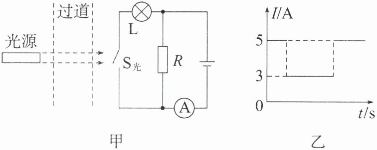 11. (2024·重庆八中月考)节约用电的小雷为走廊过道设计了一盏感应灯,简化电路图如图甲所示,灯泡L带有光感开关$S_{光}$。当无光线照射时,开关$S_{光}$闭合,灯泡发光;当有光线照射时,开关$S_{光}$断开,灯泡熄灭。保护电阻R的阻值为2Ω,有无光线照射时,电流表随时间变化情况如图乙所示。该装置电源电压为
