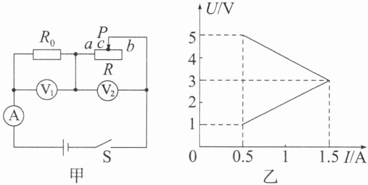 17. 如图甲所示的电路中,电源电压保持不变,闭合开关S,滑动变阻器滑片从b端向左移动到c点的过程中,两个电压表的示数随电流表示数变化的图像如图乙所示,则电源电压为