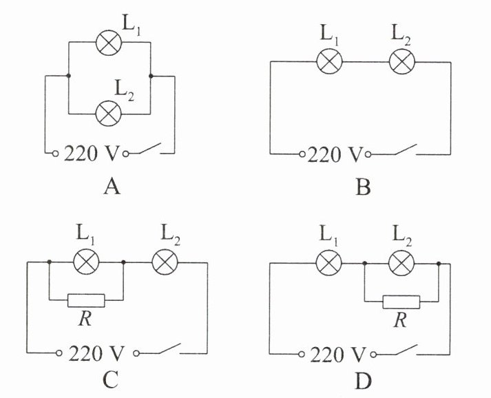 3. 如图所示,$L_{1}$、$L_{2}$为两盏白炽灯,灯$L_{1}$标有“110 V 25 W”字样,灯$L_{2}$标有“110 V 100 W”字样,R是一个未知电阻。若把它们接到电压为220 V的电路中,下列四种接法可能让两盏灯都正常发光的是(