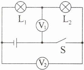 典例1 灯$L_{1}$、$L_{2}$上分别标有“6 V 3 W”和“6 V 6 W”的字样。如图所示,当开关S闭合时,灯$L_{1}$、$L_{2}$都能发光,不考虑灯丝电阻随温度的变化,则灯$L_{1}$、$L_{2}$消耗的功率之比和电压表$V_{1}$、$V_{2}$的示数之比分别是(