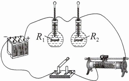 (2)闭合开关,经过一段时间后,用电阻丝$R_{1}$加热的液体温度升高了$\Delta t_{1}$,用电阻丝$R_{2}$加热的液体温度升高了$\Delta t_{2}$,那么$\Delta t_{1}$