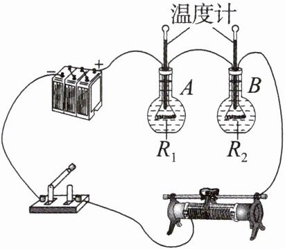 5.小明同学用如图所示的装置探究“电流通过导体产生的热量与哪些因素有关”的实验,图中烧瓶A、B内均盛有质量为0.1kg、温度相同的同种液体,液体中浸泡着阻值不同的电阻丝($R_{1}<R_{2}$),实验中记录的数据见下表。
