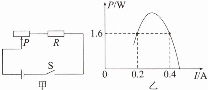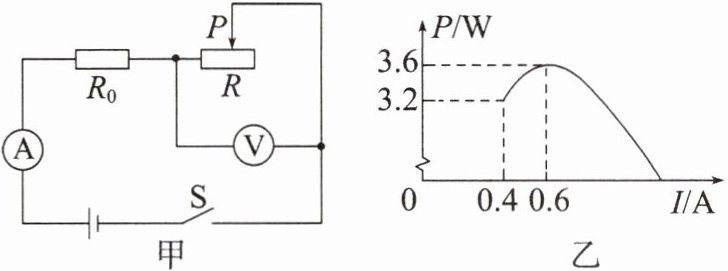 2. 如图甲所示,电源电压不变,R为定值电阻,闭合开关S,调节滑动变阻器的滑片P,滑动变阻器消耗的电功率随电流变化的关系图像如图乙所示,则电阻R的阻值为