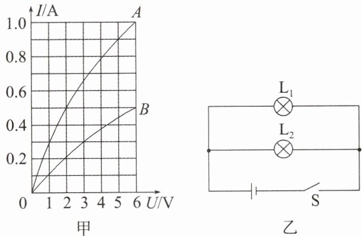 1. 小明利用规格分别为“6V 6W”的灯泡$L_{1}$和“6V 3W”的灯泡$L_{2}$进行实验。如图甲所示,曲线A和B分别为灯泡$L_{1}$和$L_{2}$的I-U图像。现将两灯泡接入如图乙所示的电路中,若灯泡均正常发光,则电路消耗的总功率为