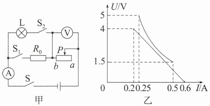 典例3 如图甲所示,电源电压恒定,电流表的测量范围为0~0.6A,电压表的测量范围为0~15V,小灯泡铭牌上的参数模糊不清。第一次,只闭合开关S、$S_{1}$,滑片P从a端移到b端;第二次,只闭合开关S、$S_{2}$,在保证电路中所有元件都安全且小灯泡两端的电压不超过其额定电压的前提下,在最大范围内移动滑片P。图乙是这两次实验过程中绘制的电压表与电流表示数的关系图像。下列判断正确的是(