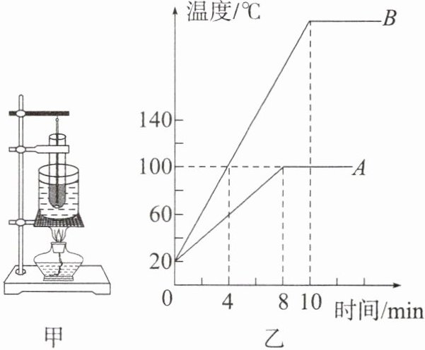 5. 小敏用如图甲所示的实验装置分别加热质量同为100g的A、B两种液体,用测得的数据绘制了温度随时间变化的图像,如图乙所示。两者相比,沸点高的是