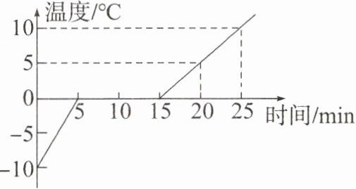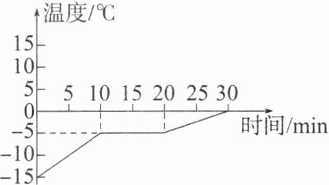 3. 为探究“固体熔化时的温度变化规律”,小欢在绝热容器内装入1kg某固体物质,其温度为$-15^{\circ }C$。把一个每分钟放出相同热量的电加热器放入容器内的固体物质中,外接电源,闭合开关,开始加热并计时。加热器在5min内放出的热量为$0.9×10^{4}J$,由实验数据得到的图像如图所示。该物质在0~10min内吸收的热量是