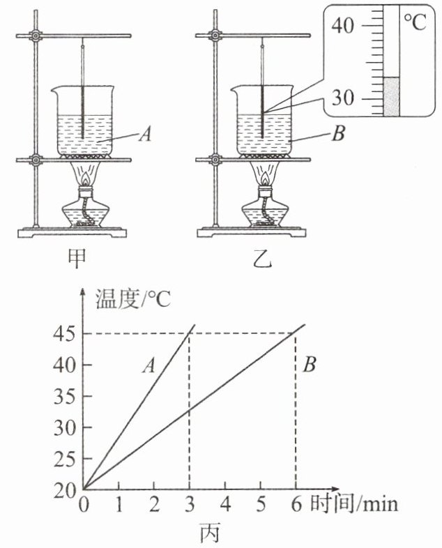 (选填“液体升高温度的多少”或“加热时间的长短”)来反映液体吸收热量的多少。(4)加热一段时间后,液体B的温度如图乙所示,为