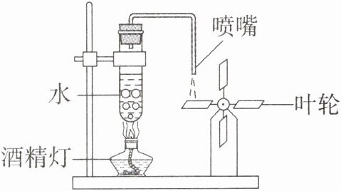 【制作一】小明制作的汽轮机模型如图所示,在试管中装入适量的水,用酒精灯加热,水沸腾后产生的蒸汽冲击叶轮使其转动。在这一过程中,水蒸气的