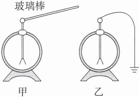 15. (2024·重庆八中期中)如图甲所示,用与丝绸摩擦过的玻璃棒接触已带电的验电器的金属球,发现验电器的金属箔先闭合再张开。取走玻璃棒后再用一根导线将此验电器的金属球与大地相连,如图乙所示。下列说法正确的是 (