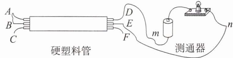 17.(2025·鲁能巴蜀中学月考)如图所示,在一根横跨长江两岸的硬塑料管内穿有三根完全相同的电线,为了辨别哪两个线头为同一根电线的两端,可以用如图所示的测通器来测试。连接A和B,将测通器的m连接在D上,当n连接E时小灯泡不发光,n连接F时小灯泡仍不发光。由此可以确定为同一根电线两端的是 (