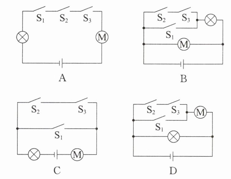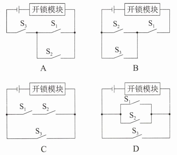 6. (2024·南开中学期末)小江同学设计了一个智能保险箱,该智能保险箱可以通过指纹独立开锁(相当于闭合开关$S_{1}$),也可通过两把钥匙同时操作开锁(相当于闭合开关$S_{2}$、$S_{3}$),该智能锁还配有24小时常亮的指示灯。下图中能准确表示该智能保险箱电路的是 (
