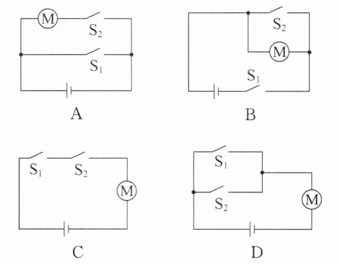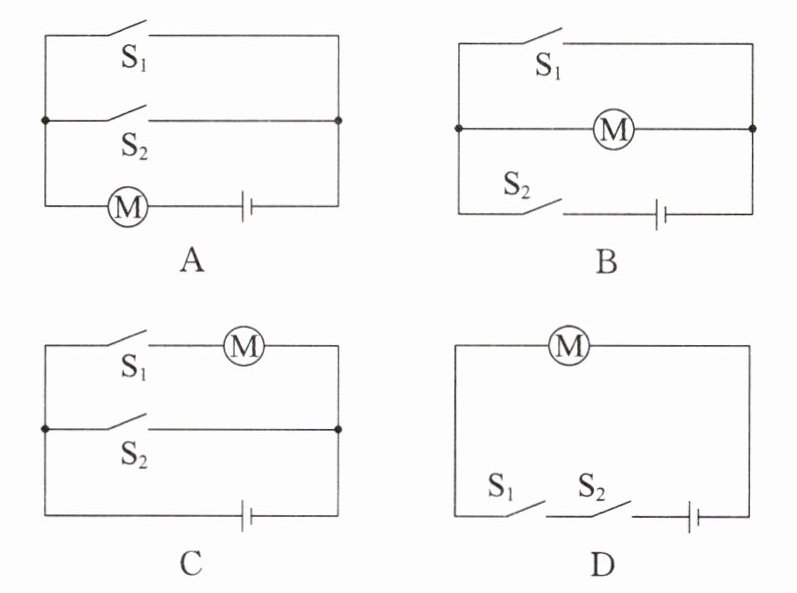 4. (2025·重庆八中开学考试)小林要设计一个天黑自动给树浇水的装置,要求:当土壤干燥且天黑时电动机启动浇水。光控开关$S_{1}$天黑时自动闭合,$S_{2}$在土壤干燥时自动闭合。下列电路中符合要求的是 (