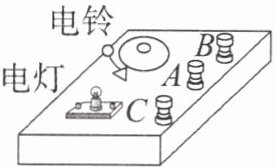 典例3 小张设计的一个电路被密封在一个不透明的盒子里。这个盒子里有电池、电灯、电铃各一个,面板上有三个接线柱A、B、C,如图所示。小启连接A、C,电灯亮,电铃不响;连接A、B,电铃响,电灯不亮;连接B、C,电灯不亮,电铃不响。小宇认为根据以上信息可以判断出这个不透明的盒子里的电路连接,请你根据上述情况在虚线框内画出这个不透明的盒子内的电路连接图。