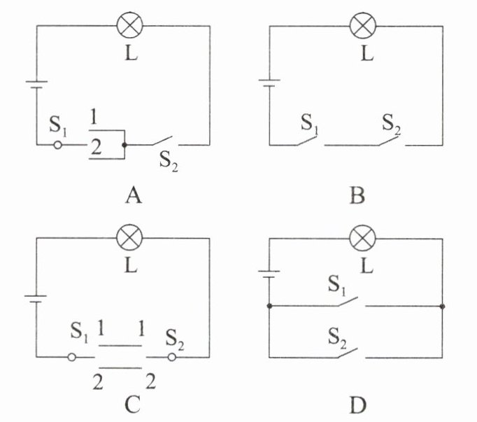8. 在小明的卧室里,同一盏吊顶灯用两个开关控制,一个安装在进门处,另一个安装在床头附近。操作任意一个开关均能独立地开灯和关灯。下列四幅图中能够满足要求的是(其中A中的开关$S_{1}$及C中的开关$S_{1}$、$S_{2}$为单刀双掷开关) (