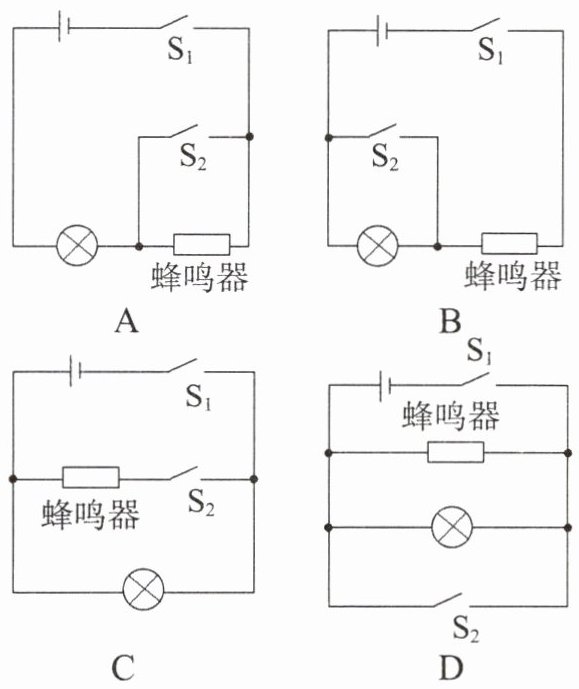 7. (2024·巴南区月考)中考体育学科测试在即,部分同学进行立定跳远测试时容易过线犯规。测试装置的基本原理是:当有同学踏上测试垫时,开关$S_{1}$、$S_{2}$同时闭合,指示灯亮;当机器感应到脚尖过线时,红外感应开关$S_{2}$断开,蜂鸣器发出声音提醒考生犯规。选项图中能实现上述功能的电路图是 (
