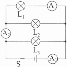 8. 如图所示,闭合开关S,电流表$A_{1}$的示数为0.18A,电流表$A_{2}$的示数为0.32A,通过灯泡$L_{3}$的电流为0.15A,则电流表$A_{3}$的示数为