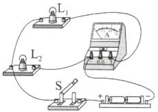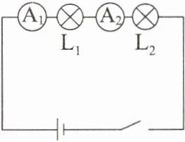 9. (物理观念)如图所示,闭合开关后,电流表$A_{1}$的示数为0.38A,电流表$A_{2}$的示数为0.40A,则通过两只灯泡的电流