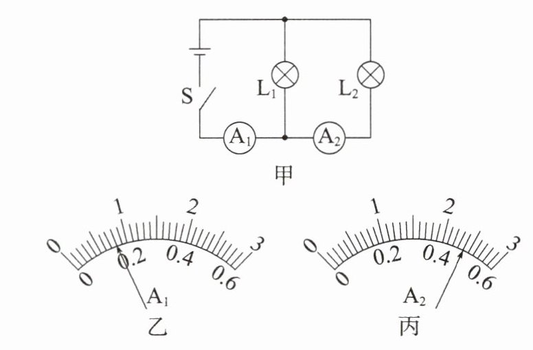 (2)当只闭合开关S₁、S₂时,电流表A₁的示数如图乙所示,则通过灯L₁、L₂的电流分别是