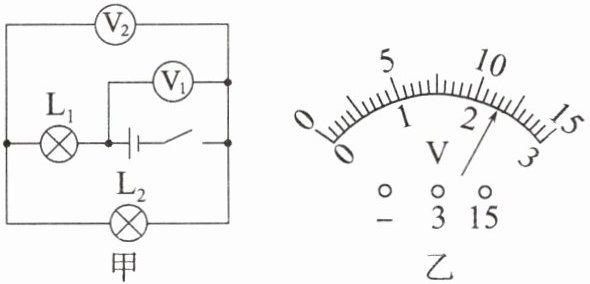 5. (2025·重庆一中月考改编)如图甲所示的电路中,开关闭合后,两个电压表指针偏转均如图乙所示,则灯泡$L_{1}$和$L_{2}$两端的电压分别为(
