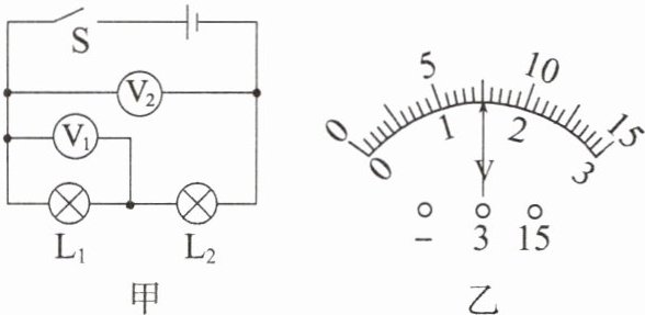 14. (一本原创)如图甲所示的电路中,开关S闭合后,电路中通过的电流是0.1A,电压表$V_{1}$和$V_{2}$均有示数,且指针偏转角度相同,如图乙所示,则灯$L_{1}$、$L_{2}$两端的电压共有