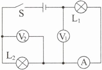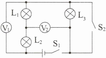 (2)开关 $ S_1 $ 闭合、$ S_2 $ 断开时,$ L_1 $、$ L_2 $ 和 $ L_3 $ 串联,电压表 $ V_1 $ 测量 $ L_1 $、$ L_2 $ 两端总电压,电压表 $ V_2 $ 测量 $ L_1 $、$ L_3 $ 两端总电压,由串联电路电压规律可知,$ L_2 $ 两端电压 $ U_{L2} = U - U_2 = 9 \text{ V} - 7 \text{ V} = 2 \text{ V} $