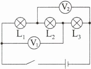 (3)开关 $ S_1 $、$ S_2 $ 均闭合时,$ L_1 $ 与 $ L_2 $ 串联,$ L_3 $ 被短路,电压表 $ V_2 $ 测量 $ L_1 $ 两端电压, $ L_3 $ 两端电压 $ U_{L3}' = 0 \text{ V} $