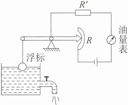 9.一种自动测定油箱内油面高度的装置如图所示,R是滑动变阻器,滑动变阻器R的金属滑片是杠杆的一端,$R'$是定值电阻。从油量表指针所指的刻度,就可以知道油箱内油面的高度。